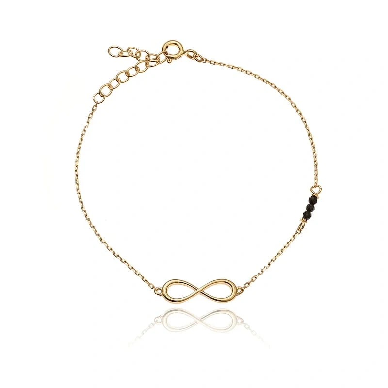 - Delikatna bransoletka pozłacana z symbolem nieskończoności i drobnymi kamieniami onyksu to subtelny dodatek o wyjątkowym znaczeniu. Idealna na co dzień i jako elegancki prezent dla bliskiej osoby.