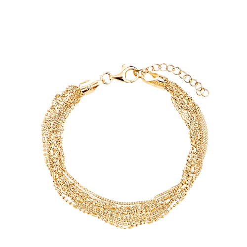 Elegancka bransoletka pozłacana wykonana z wysokiej jakości srebra pr. 925, pokrytego warstwą złota, zachwyca wielołańcuszkową formą i subtelnym blaskiem. Delikatny, a jednocześnie efektowny splot pięknie układa się na nadgarstku, nadając stylizacji klasy i kobiecego charakteru. Bransoletka doskonale sprawdzi się zarówno na co dzień, jak i jako uzupełnienie wieczorowych zestawów. To ponadczasowa srebrna biżuteria pozłacana, która będzie doskonałym wyborem na prezent dla kobiety ceniącej elegancję i modny design.