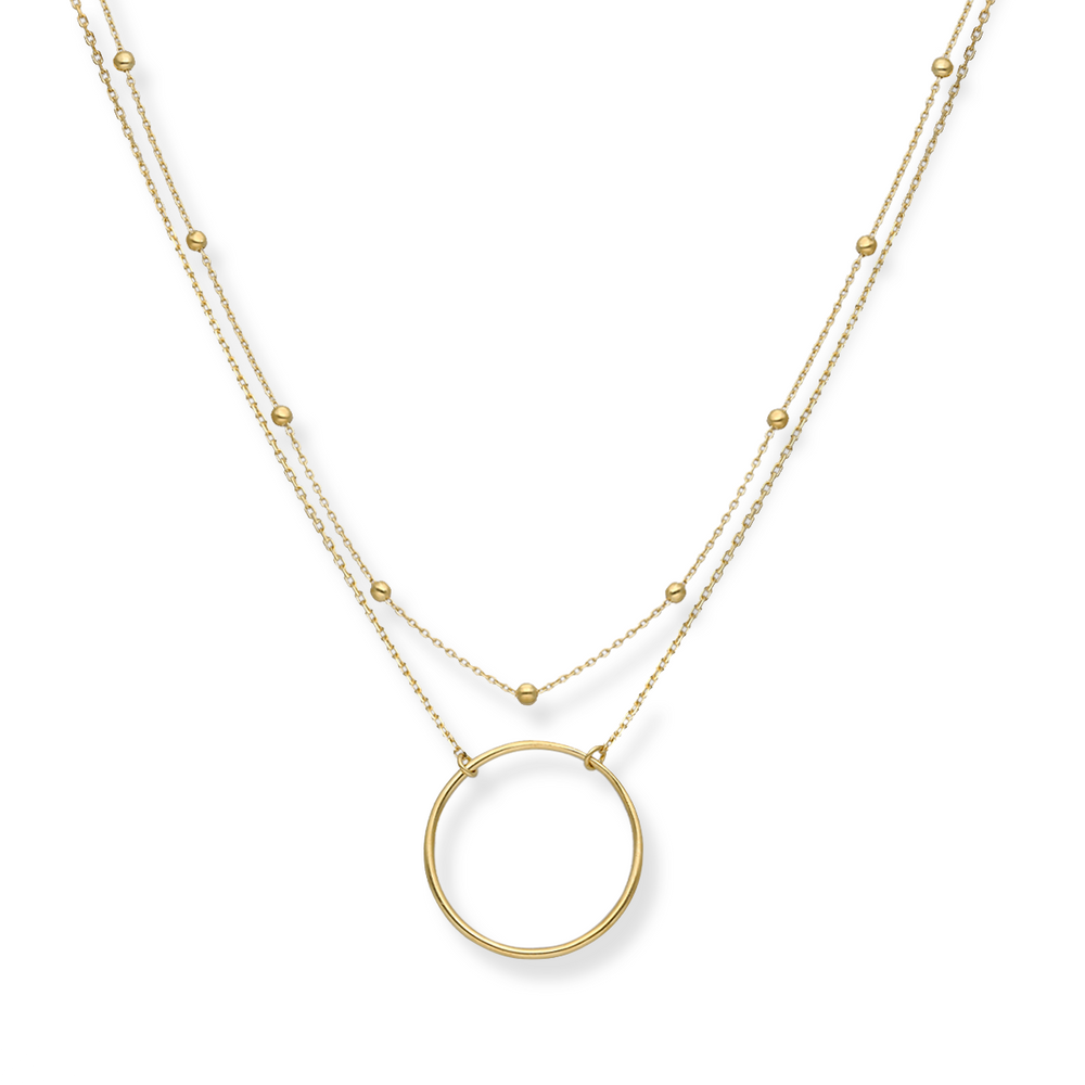 - Stylowy naszyjnik pozłacany z podwójnym łańcuszkiem to delikatna i modna ozdoba, która pięknie podkreśla dekolt. Zawieszka w formie kółka oraz drobne kuleczki dodają mu lekkości i nowoczesnego charakteru.