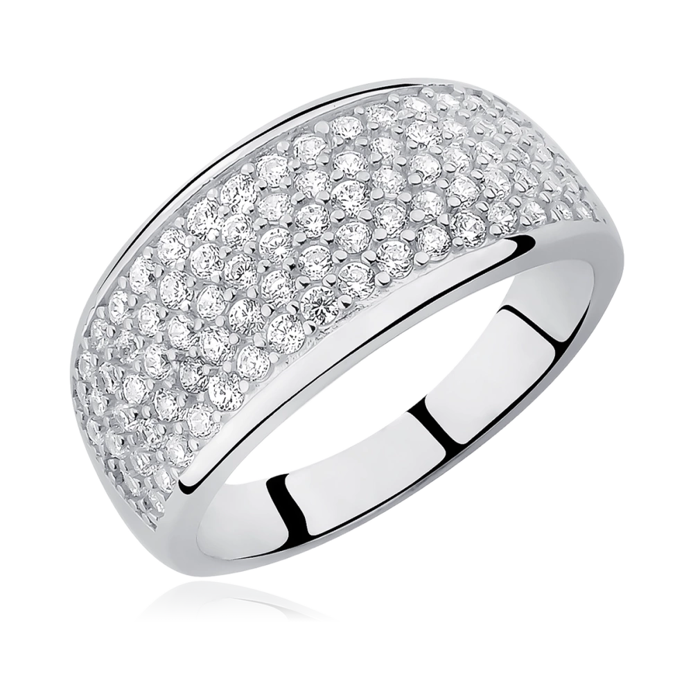 Ekskluzywna obrączka srebrna wykonana ze srebra pr. 925 to doskonały wybór dla osób, które pragną połączyć klasykę z wyrazistym połyskiem. Szeroki front obrączki został bogato wysadzony drobnymi, misternie osadzonymi cyrkoniami, które tworzą powierzchnię o intensywnym, biżuteryjnym blasku. Ten srebrny pierścionek z cyrkoniami doskonale podkreśla styl zarówno przy codziennych stylizacjach, jak i podczas wyjątkowych okazji. Starannie wykonana i solidna, będzie cieszyć swoim wyjątkowym wyglądem przez długi czas.