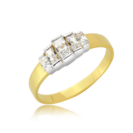 - Złoty pierścionek pr. 585 ozdobiony bezbarwnymi cyrkoniami w kształcie bagietek to efektowny dodatek o klasycznym uroku. Połączenie żółtego złota z rodowaną oprawą dodaje mu elegancji i szlachetnego wykończenia.