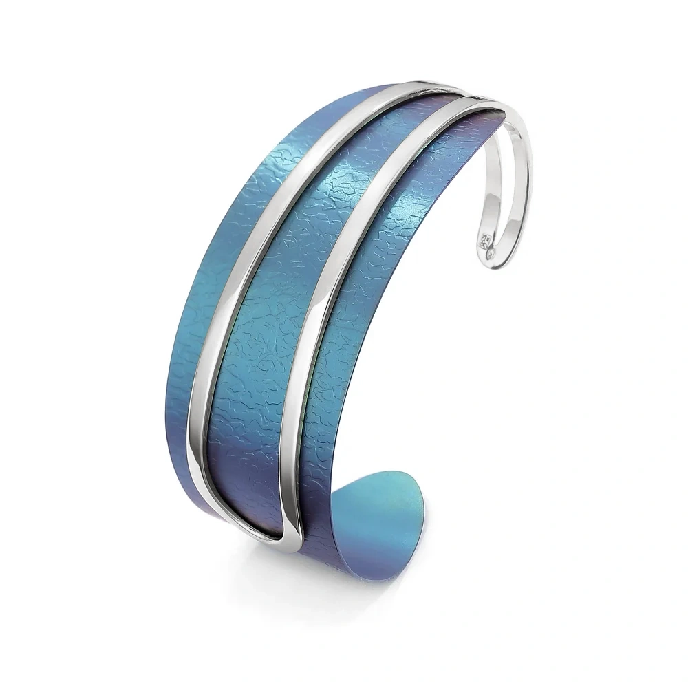 Wyjątkowa bransoletka srebrna z tytanem to połączenie współczesnego wzornictwa i artystycznego charakteru. Szeroki pas barwionego tytanu w intensywnym, zielonym odcieniu tworzy efektowną, głęboką kolorystykę, która pięknie kontrastuje z chłodnym blaskiem srebra pr. 925. Płynne, asymetryczne linie ze srebra dodają całości lekkości i dynamicznego kształtu, podkreślając wyjątkowy styl bransoletki. To idealny wybór dla kobiet poszukujących nowoczesnej biżuterii, która wyróżnia się unikatową barwą, lekkością i starannym wykonaniem.