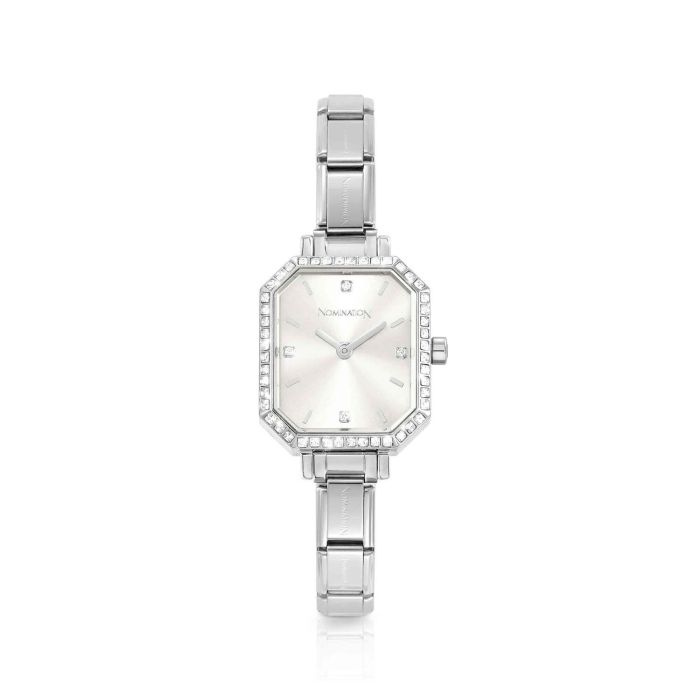 Zegarek NOMINATION ITALY Composable Classic z cyrkoniami to elegancja w najczystszej postaci – idealna propozycja dla kobiet ceniących subtelny blask i personalizację. Wykonany z wysokiej jakości stali szlachetnej w kolorze srebrnym, wyróżnia się prostokątną kopertą o ozdobnej ramie wysadzanej błyszczącymi cyrkoniami oraz delikatnie połyskującą tarczą.