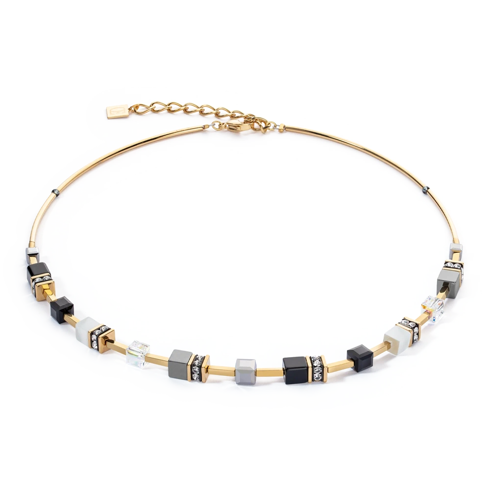 Nowoczesny i niezwykle elegancki naszyjnik Cœur de Lion GeoCUBE® to wyjątkowe połączenie klasy i designu. Ręcznie wykonany z hematytu, syntetycznego tygrysiego oka, kryształów Swarovski®, rondli Rhinestone, szkła oraz stali szlachetnej w odcieniu złota. Geometryczne kostki w stonowanych barwach czerni, szarości i bieli tworzą harmonijną kompozycję, która doskonale podkreśla kobiecą elegancję.