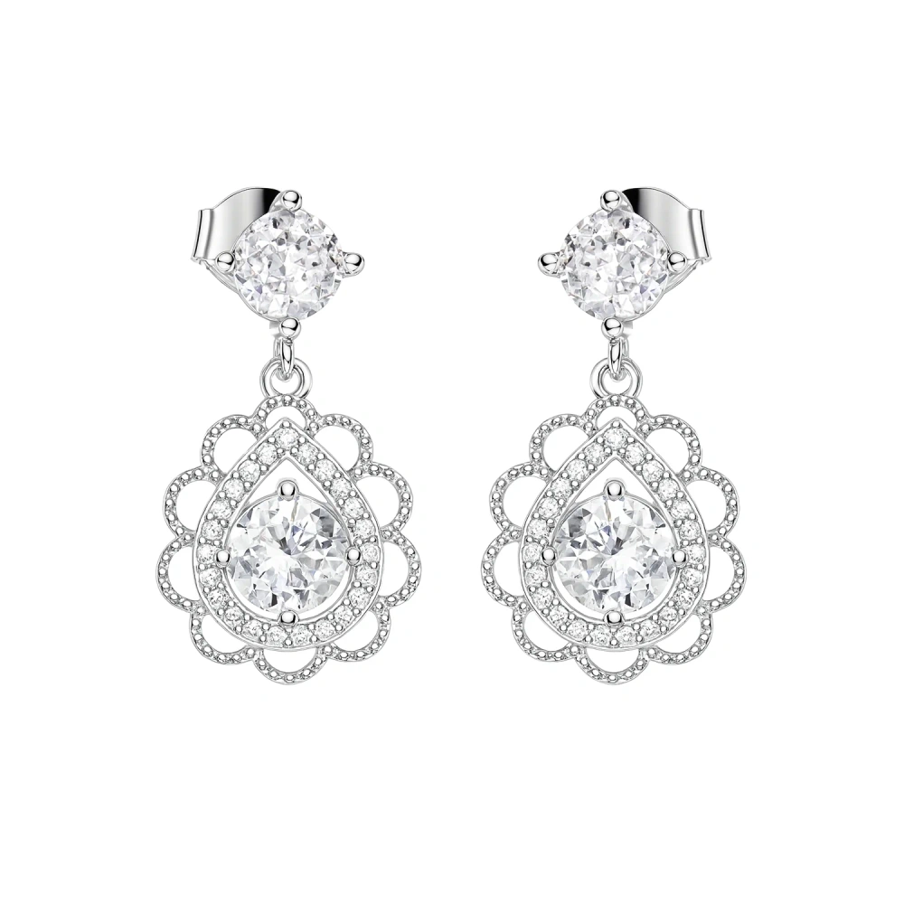 - Eleganckie srebrne kolczyki z cyrkoniami zachwycają misterną oprawą i efektownym blaskiem, idealnym na wyjątkowe okazje. To biżuteria, która pięknie rozświetla twarz i dodaje stylizacji wyrafinowanego charakteru.