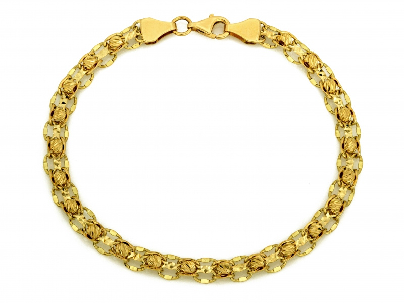 Wyjątkowa bransoletka ze złota pr. 585 została stworzona z misternie formowanych ogniw, które tworzą efektowny, bogaty wizualnie splot. Połyskujące powierzchnie i przestrzenna forma sprawiają, że biżuteria prezentuje się niezwykle elegancko, stanowiąc idealny wybór na co dzień oraz na wyjątkowe okazje. To ponadczasowy model, który doskonale sprawdzi się również jako luksusowy prezent dla osoby ceniącej wyrafinowaną, klasyczną biżuterię.