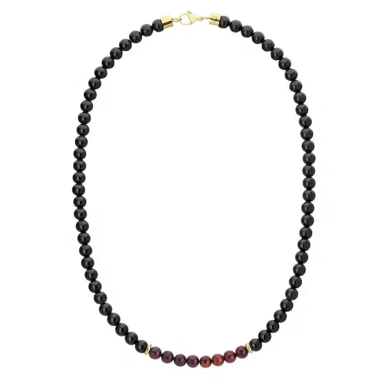 Elegancki naszyjnik ze stali szlachetnej został wykonany z połączenia naturalnych kamieni, które nadają mu wyjątkowego i szlachetnego charakteru. Czarne koraliki tworzą klasyczną bazę, subtelnie uzupełnioną akcentami z bursztynu i turmalinu, które przyciągają wzrok i nadają biżuterii oryginalności. Prosta forma sprawia, że naszyjnik doskonale sprawdzi się zarówno jako codzienny dodatek, jak i stylowy prezent dla osoby ceniącej naturalne kamienie i nowoczesny design.