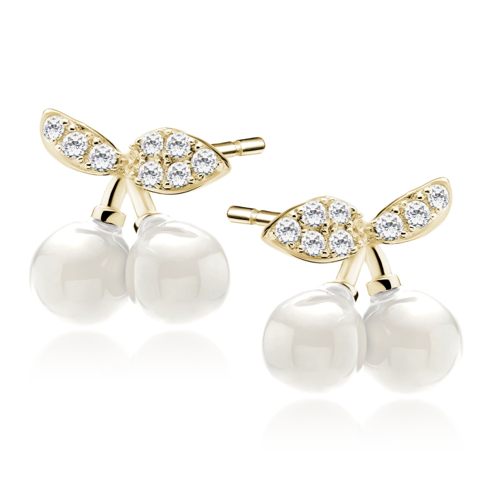 - Urocze kolczyki pozłacane wisienki z perełkami to delikatna biżuteria, która dodaje stylizacji subtelnego blasku i dziewczęcego uroku. Wykonane z srebra pr. 925 pozłacanego, będą pięknym wyborem na prezent.