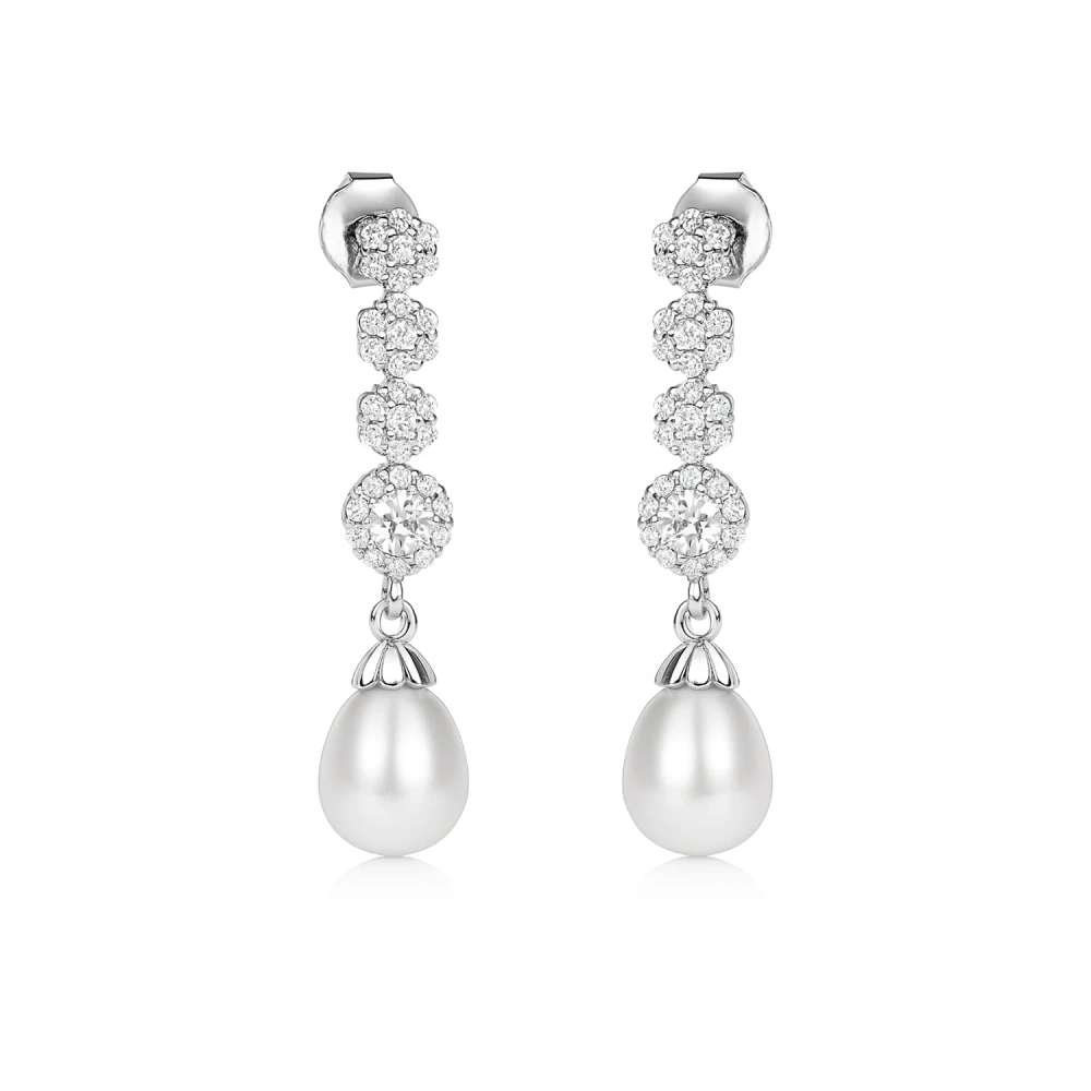 Stylowe kolczyki srebrne wykonane z wysokiej jakości srebra pr. 925, które zachwycają połączeniem klasycznej elegancji z dekoracyjnym detalem. Górną część kolczyków tworzą drobne, kwiatowe motywy wysadzane błyszczącymi cyrkoniami, prowadzące do centralnego elementu o wyrazistym połysku. Całość wieńczy delikatna perła, nadająca biżuterii ponadczasowego i szlachetnego charakteru. Smukła, wisząca forma pięknie podkreśla linię szyi i sprawdzi się zarówno jako biżuteria ślubna, wieczorowa, jak i elegancki dodatek na prezent.