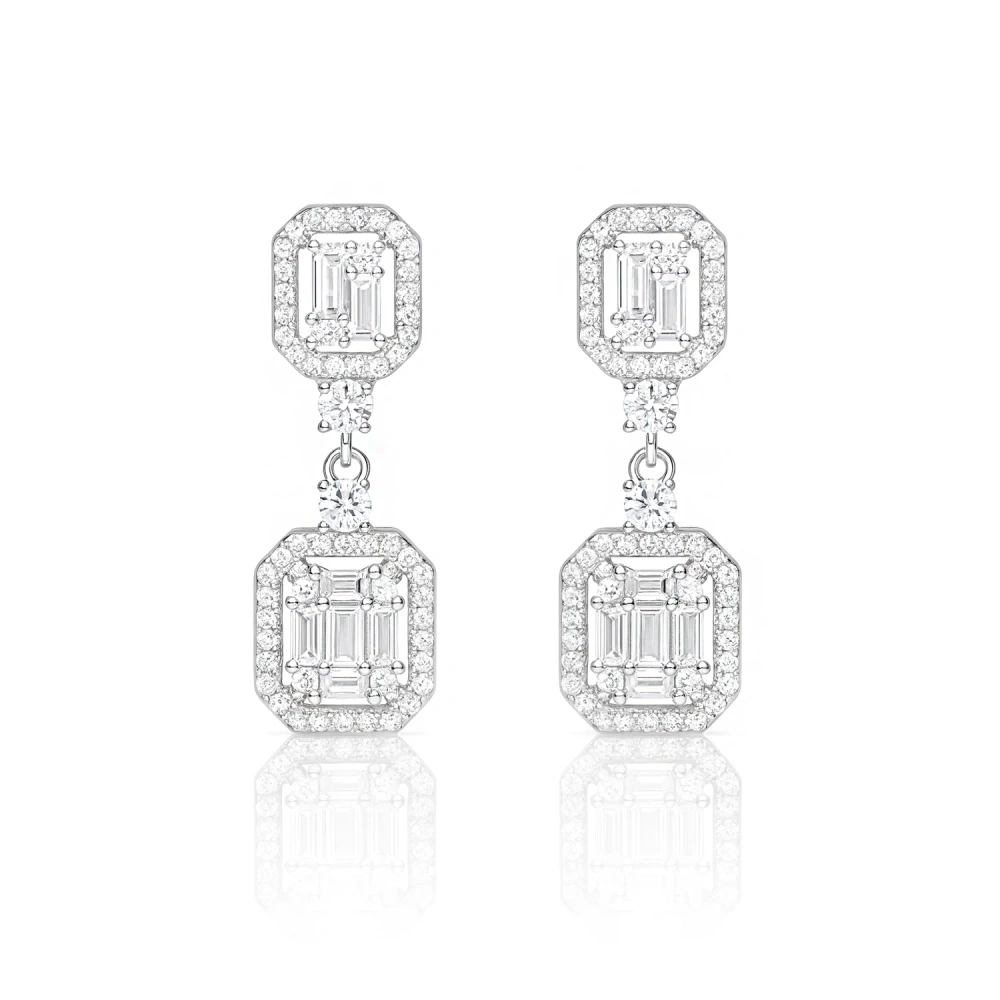 - Eleganckie kolczyki srebrne srebro pr. 925 o geometrycznej formie, zdobione lśniącymi cyrkoniami w szlifie bagietowym i klasycznym. Wyrafinowany design sprawia, że to idealna biżuteria na prezent oraz na wyjątkowe okazje.