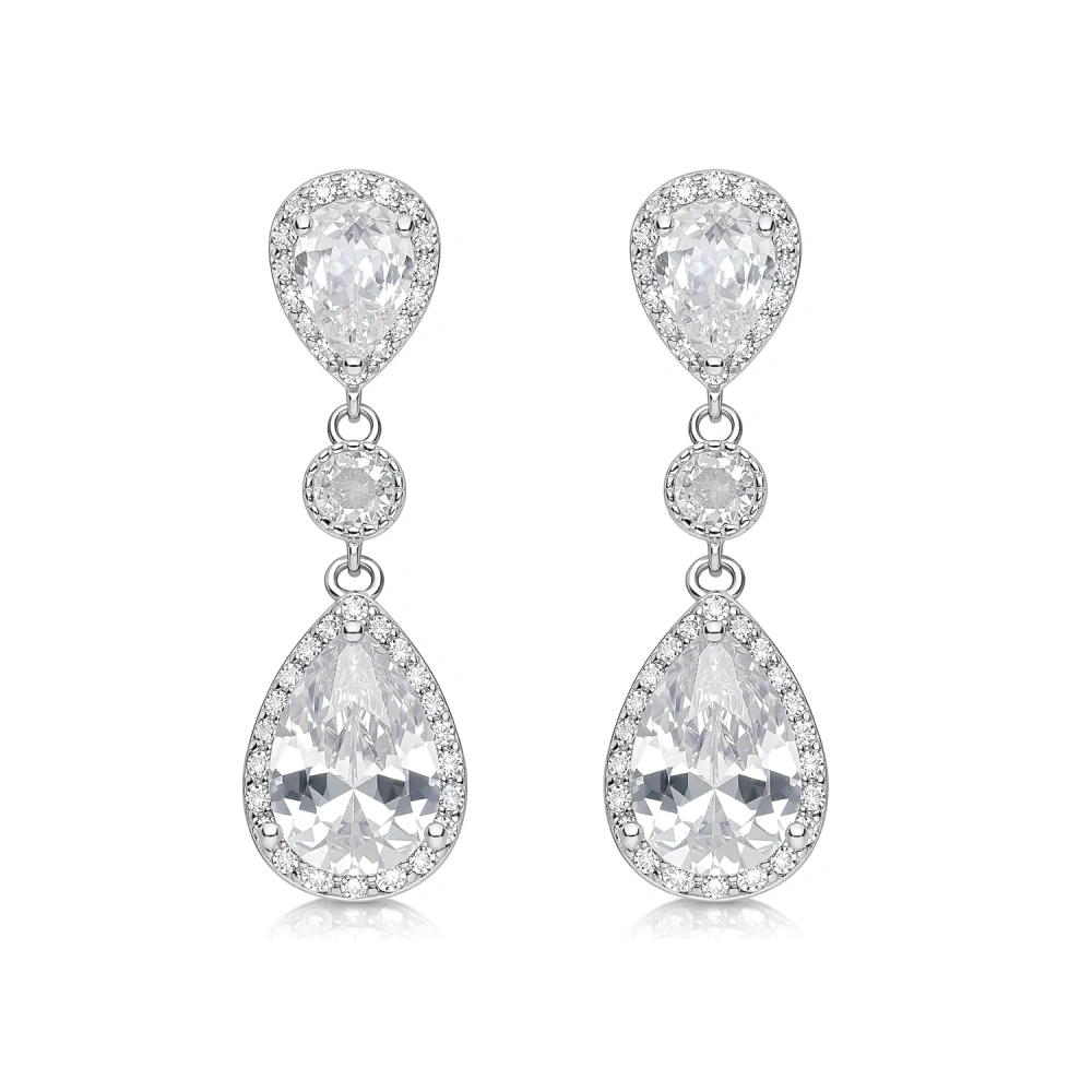 Eleganckie kolczyki srebrne wykonane z wysokiej jakości srebra pr. 925, ozdobione starannie osadzonymi cyrkoniami o szlifie w kształcie kropli. Kompozycja z trzech elementów, zwieńczona większą, lśniącą kroplą, nadaje biżuterii luksusowego i ponadczasowego charakteru. Subtelne obwódki z drobnych cyrkonii pięknie podkreślają blask kamieni, czyniąc kolczyki doskonałym wyborem jako biżuteria wieczorowa i okazjonalna. To klasyczna propozycja biżuterii srebrnej, która elegancko dopełnia stylizacje na ważne uroczystości.