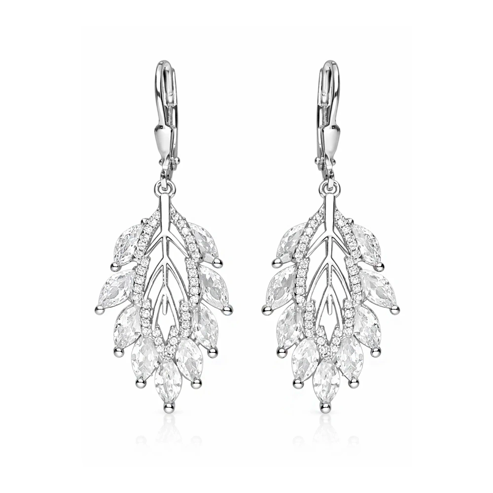 Eleganckie kolczyki srebrne wykonane z wysokiej jakości srebra pr. 925, ozdobione kompozycją cyrkonii ułożonych w kształt liścia. Precyzyjnie osadzone kamienie pięknie odbijają światło, nadając biżuterii luksusowego i subtelnego charakteru. Smukła, wisząca forma sprawia, że kolczyki doskonale sprawdzą się jako biżuteria wieczorowa i okazjonalna, elegancko dopełniając stylizacje na uroczystości i ważne wydarzenia. To ponadczasowa propozycja biżuterii srebrnej dla kobiet ceniących klasykę z nutą finezji.