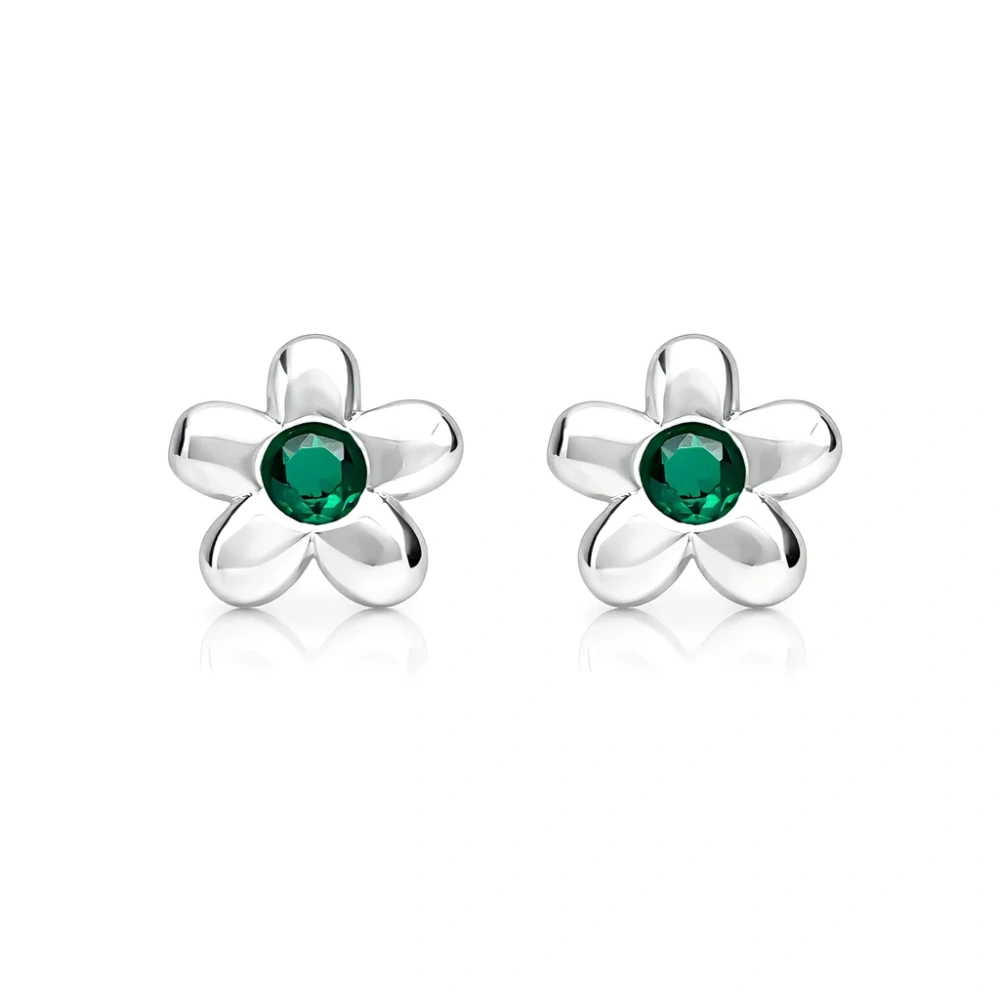 - Eleganckie kolczyki ze srebra pr. 925 w kształcie kwiatów, zdobione zielonymi cyrkoniami w centrum. Delikatna forma sprawia, że są idealne na prezent zarówno dla kobiety, jak i dla dziewczynki.