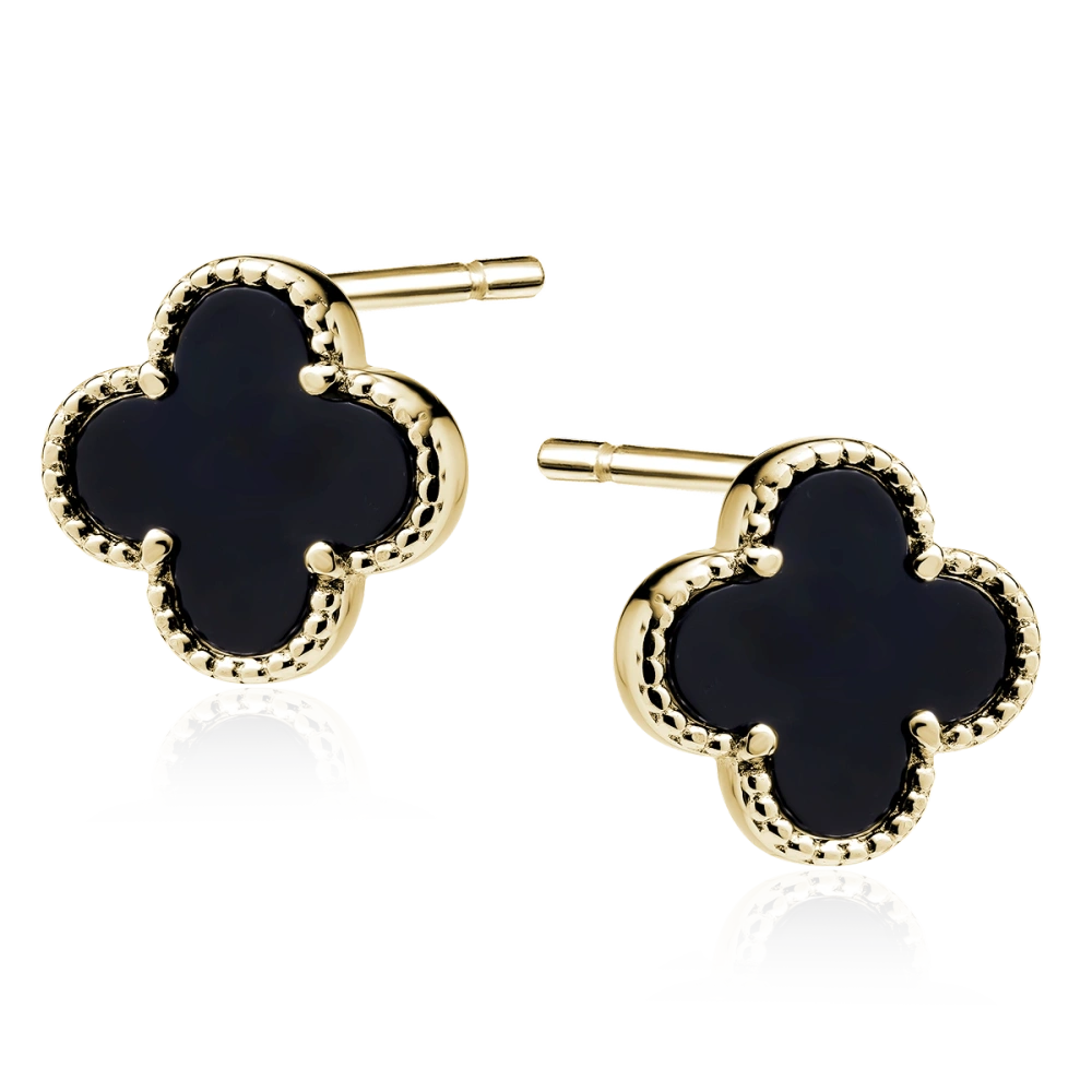 - Eleganckie kolczyki ze srebra pr. 925 w kształcie koniczyny, zdobione głęboką czernią onyksu, stanowią stylowy i ponadczasowy dodatek. Klasyczna forma sprawia, że są doskonałym wyborem na prezent.