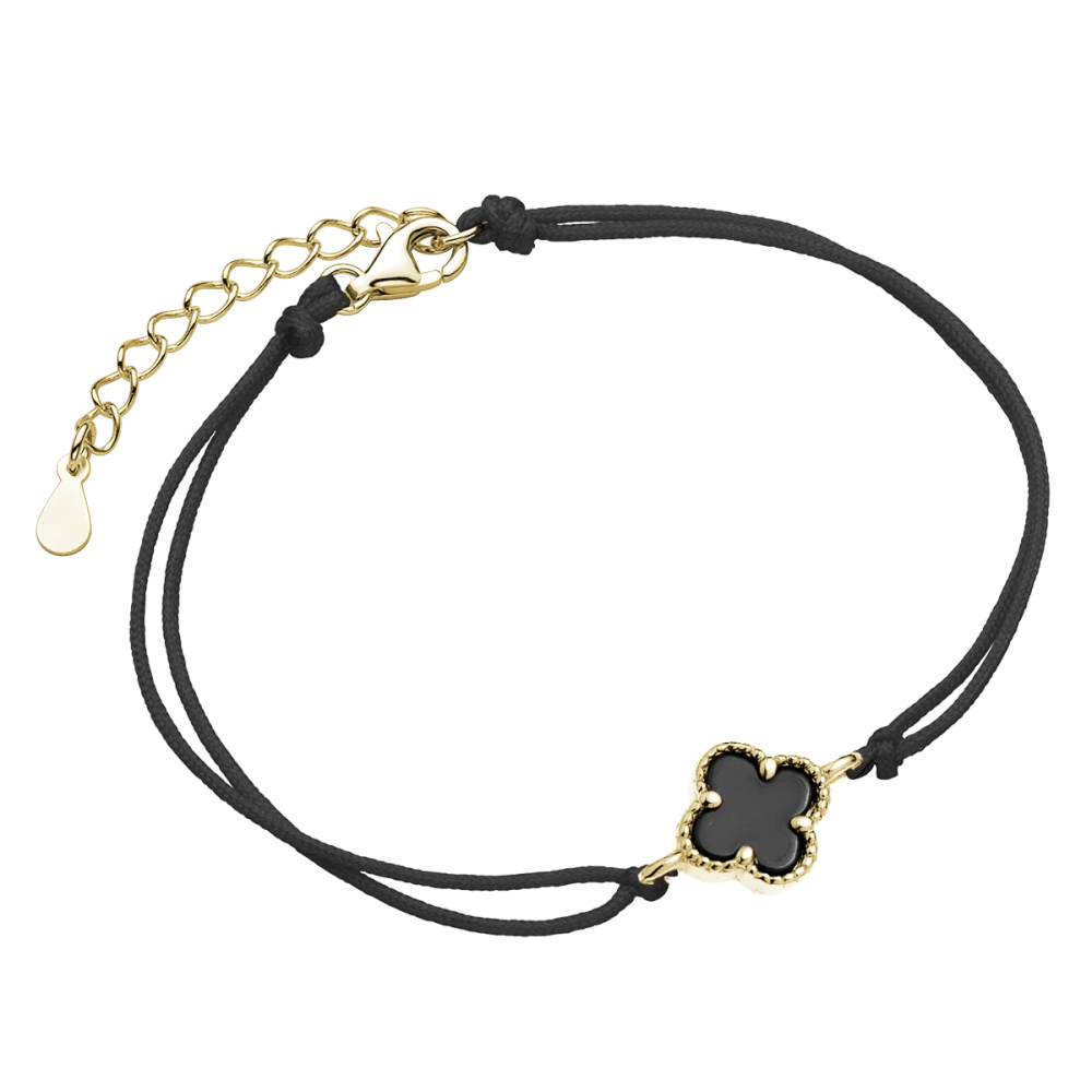 Bransoletka pozłacana na czarnym sznurku koniczynka z onyksem