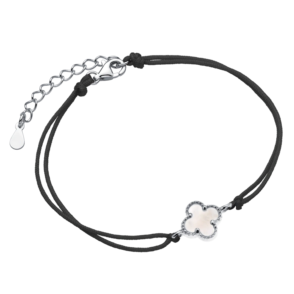 - Delikatna bransoletka ze srebra pr. 925 na czarnym sznurku, ozdobiona motywem koniczyny z masą perłową, zachwyca subtelnym blaskiem. To elegancka biżuteria srebrna na prezent, idealna na co dzień.
