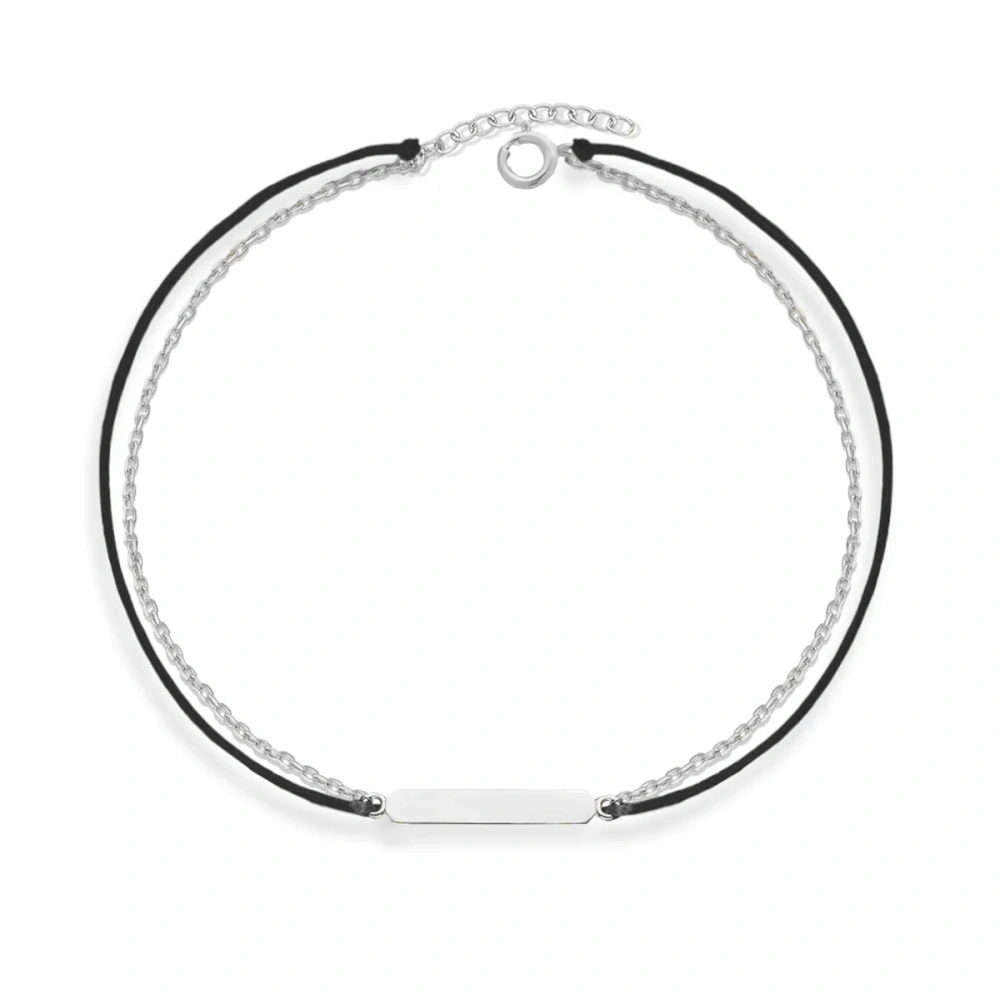 - Minimalistyczna bransoletka srebrna pr. 925 na czarnym sznurku z subtelną blaszką to elegancki dodatek, który podkreśla codzienny styl. Idealna na prezent, zachwyca prostotą i nowoczesnym charakterem.